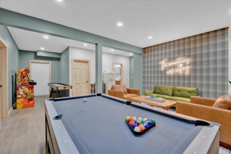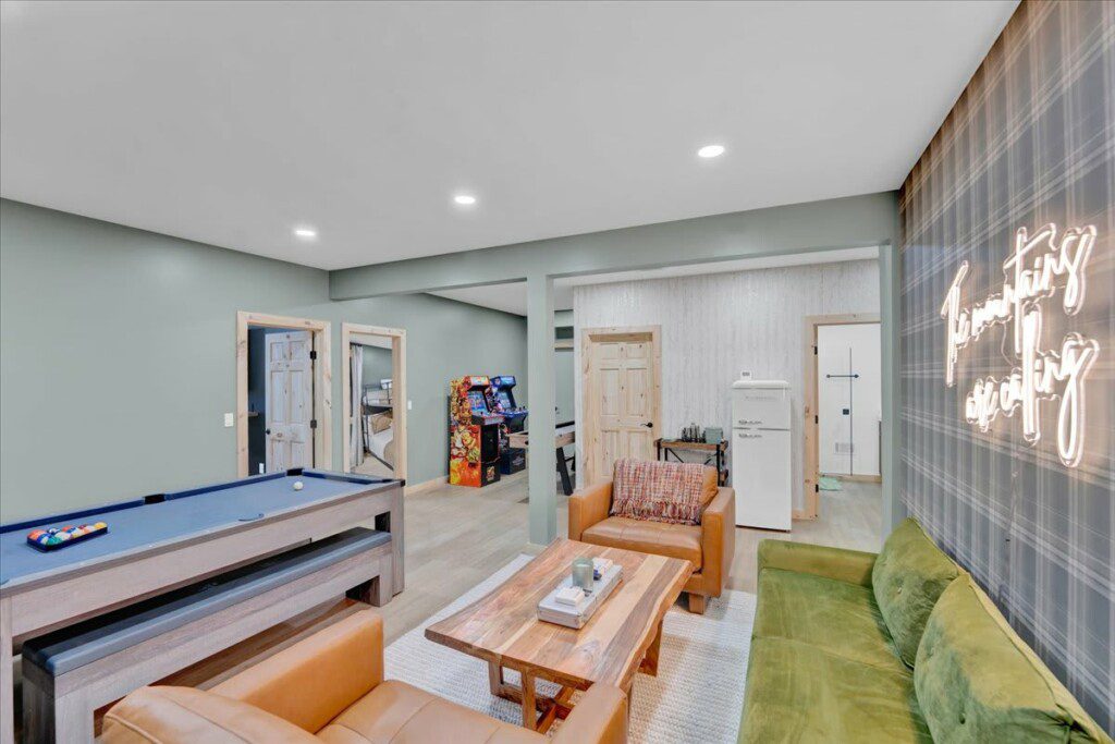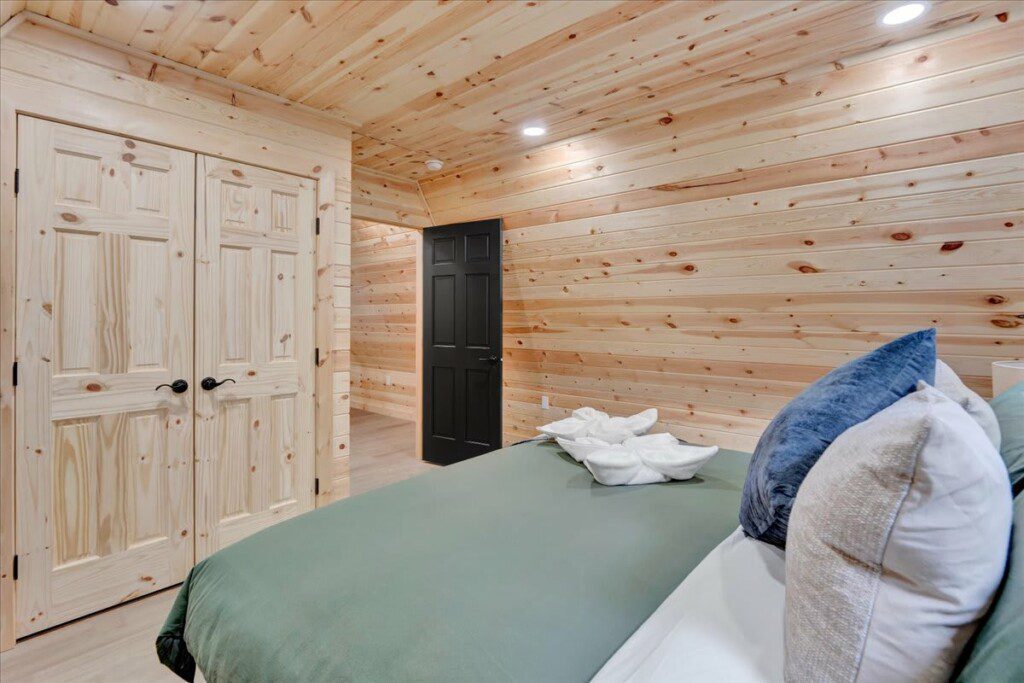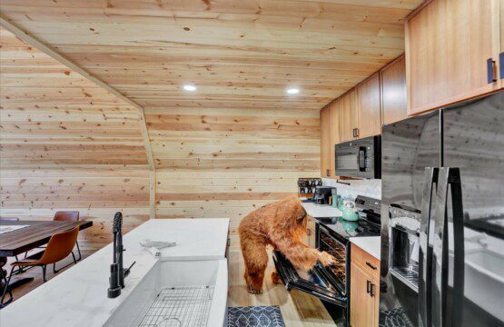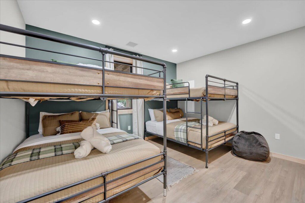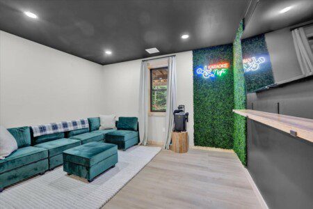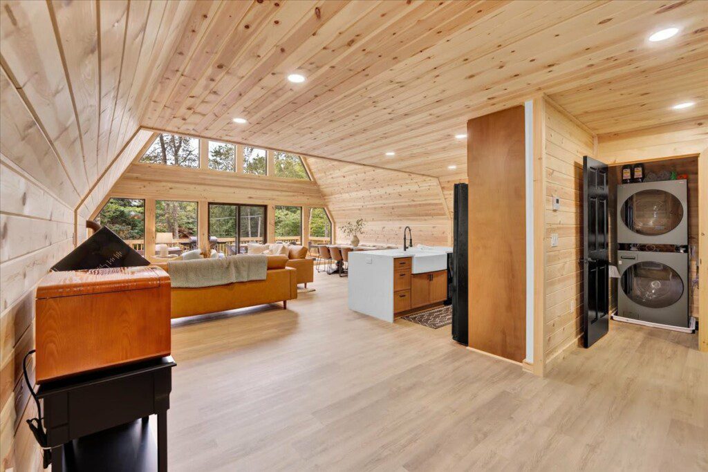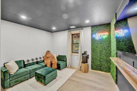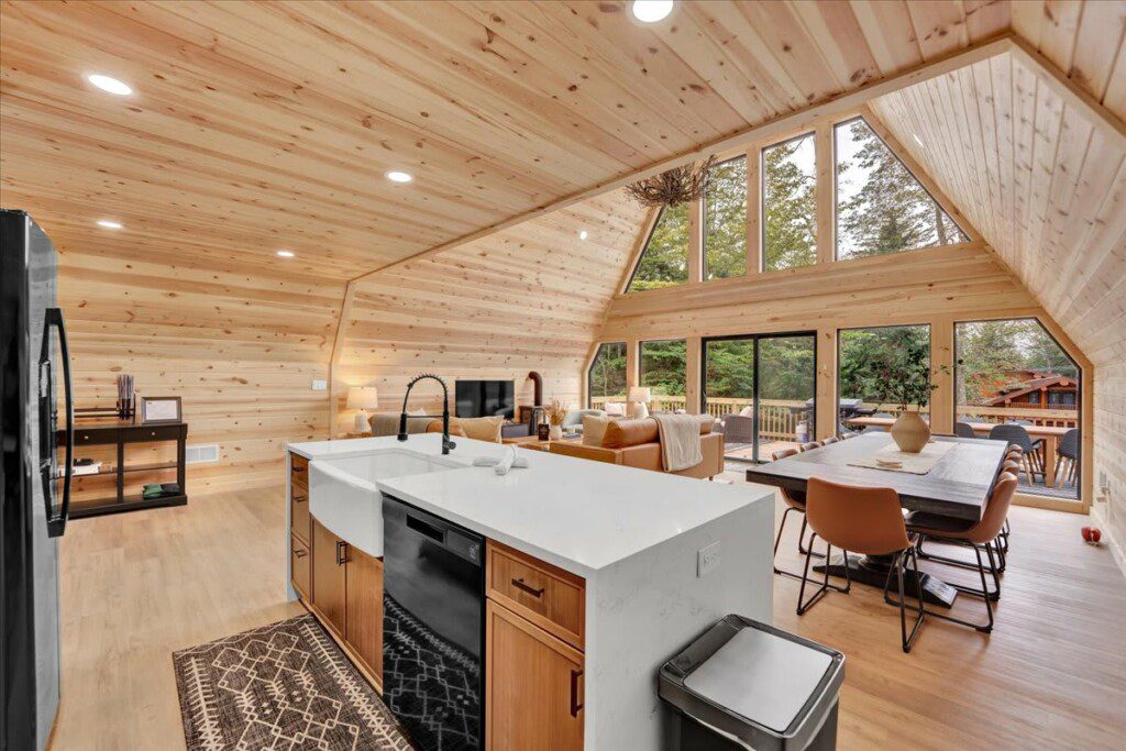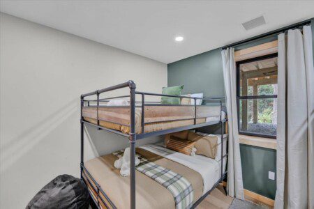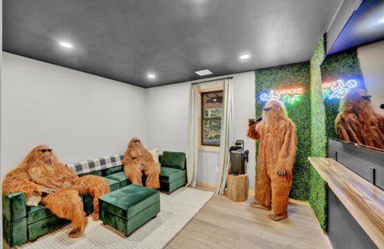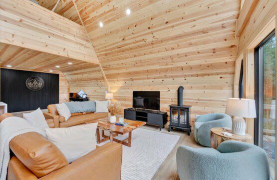 This expansive 7-bedroom home accommodates 16 guests and features stunning vaulted pine ceilings, an open-concept living space, and a fully equipped kitchen. On the main floor, you’ll find bedrooms with forest views and an upper loft with surprise hammock. The lower level offers a stylish karaoke room, arcade games, and additional bedrooms. Outside gather around the massive firepit, or enjoy the deck with a BBQ. Lake access is just a few minute walk or lightspeed drive away. Modern conveniences include smart TVs, a coffee station, record station with a wonderful selection, and high-speed Wi-Fi.