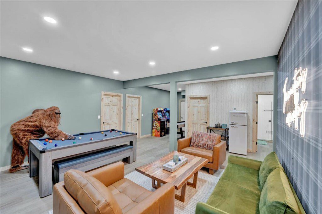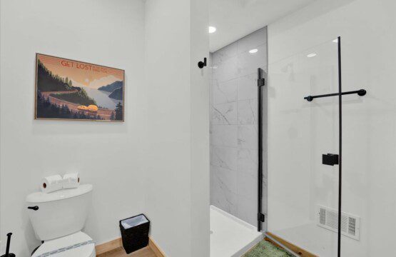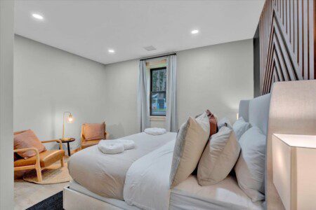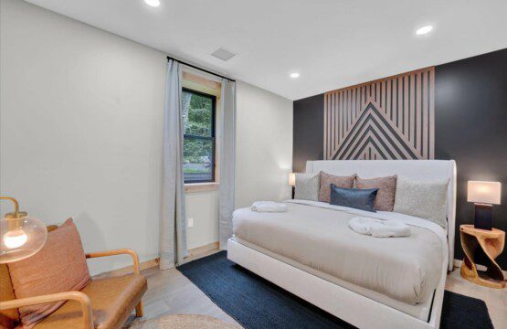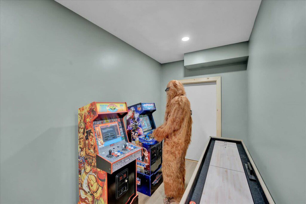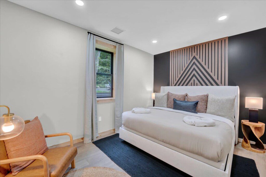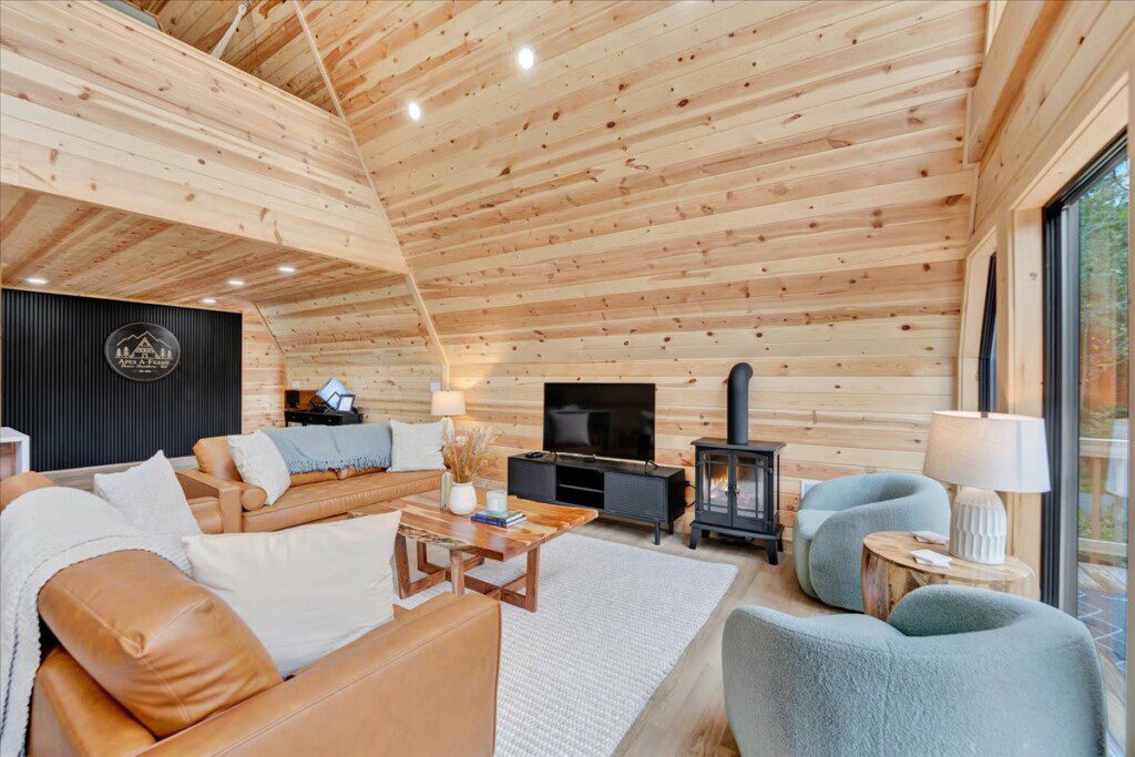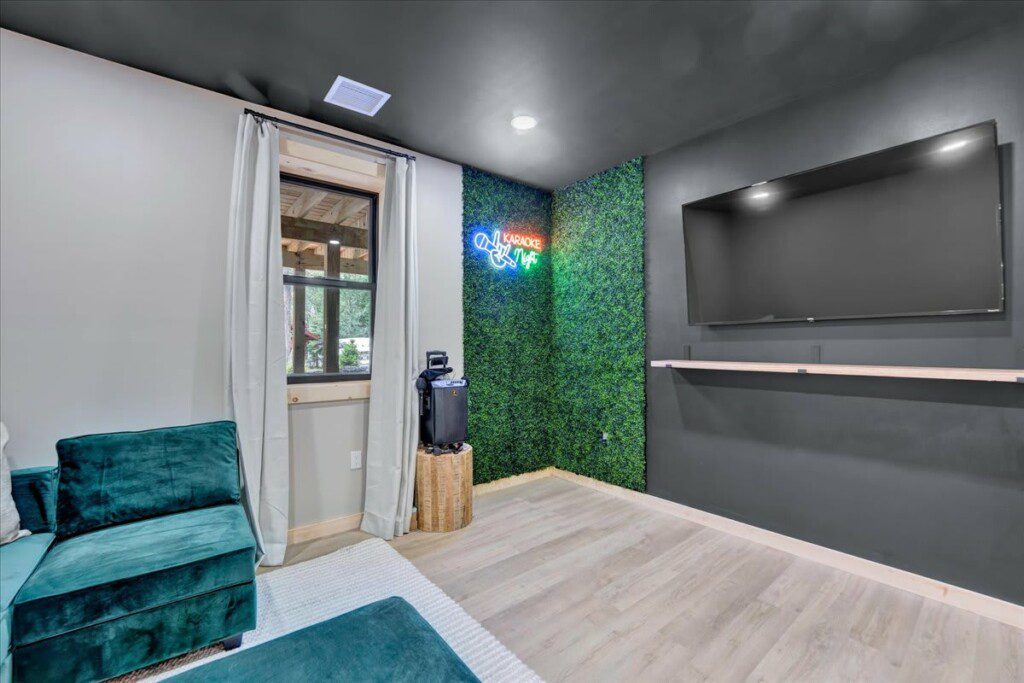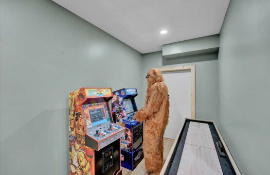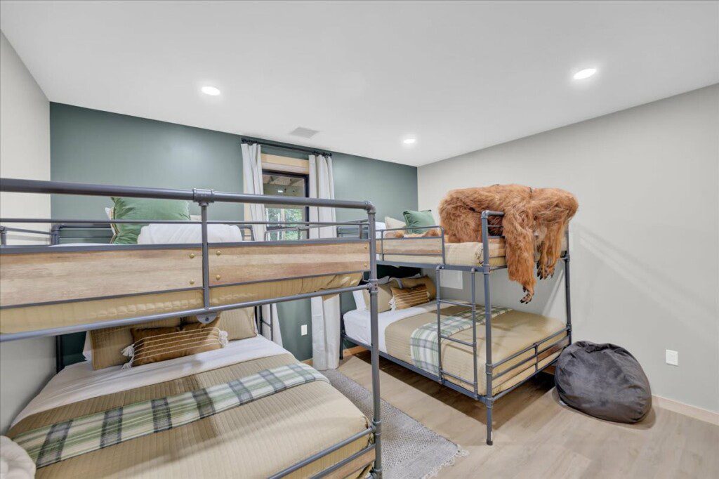 This expansive 7-bedroom home accommodates 16 guests and features stunning vaulted pine ceilings, an open-concept living space, and a fully equipped kitchen. On the main floor, you’ll find bedrooms with forest views and an upper loft with surprise hammock. The lower level offers a stylish karaoke room, arcade games, and additional bedrooms. Outside gather around the massive firepit, or enjoy the deck with a BBQ. Lake access is just a few minute walk or lightspeed drive away. Modern conveniences include smart TVs, a coffee station, record station with a wonderful selection, and high-speed Wi-Fi.