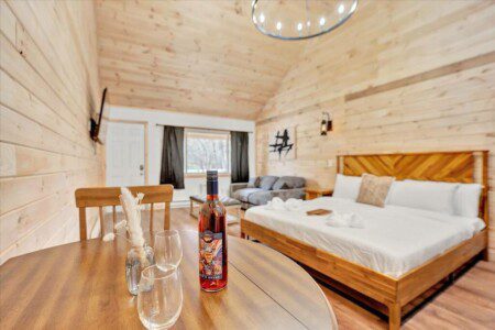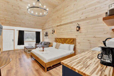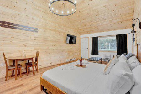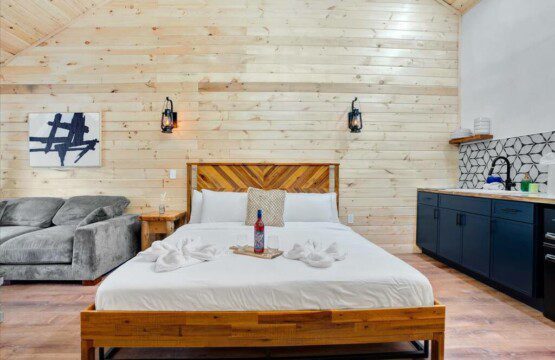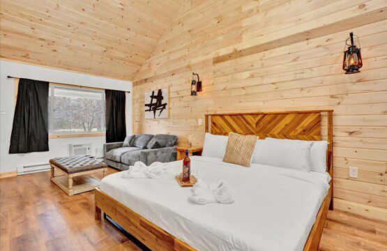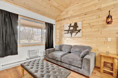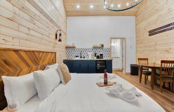 Have a relaxing stay in this charming cabin themed unit with modern amenities and tasteful décor, perfect to nestle up in on a snowy day as you watch the flakes fall gentle onto the pine trees around you.