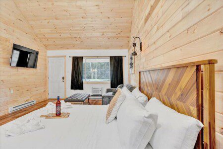 Nestle into your plush king mattress with cozy sheets and plenty of pillows, grab your favorite snacks and drinks, and enjoy your favorite TV show under vaulted pine ceilings
