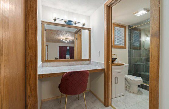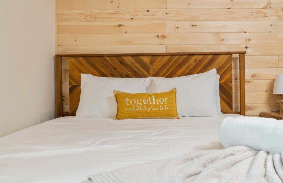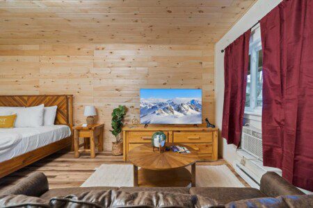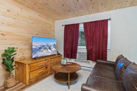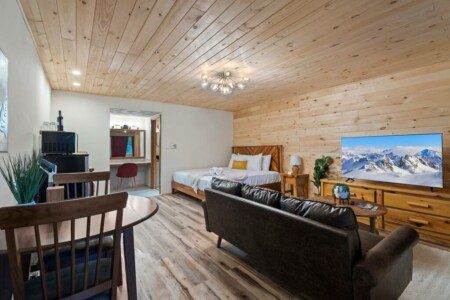 Have a relaxing stay in this charming cabin themed unit with modern amenities and tasteful décor, perfect to nestle up in on a snowy day as you watch the flakes fall gentle onto the pine trees around you.