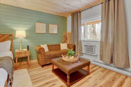 Have a relaxing stay in this charming cabin themed unit with modern amenities and tasteful décor, perfect to nestle up in on a snowy day as you watch the flakes fall gentle onto the pine trees around you.