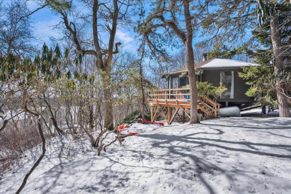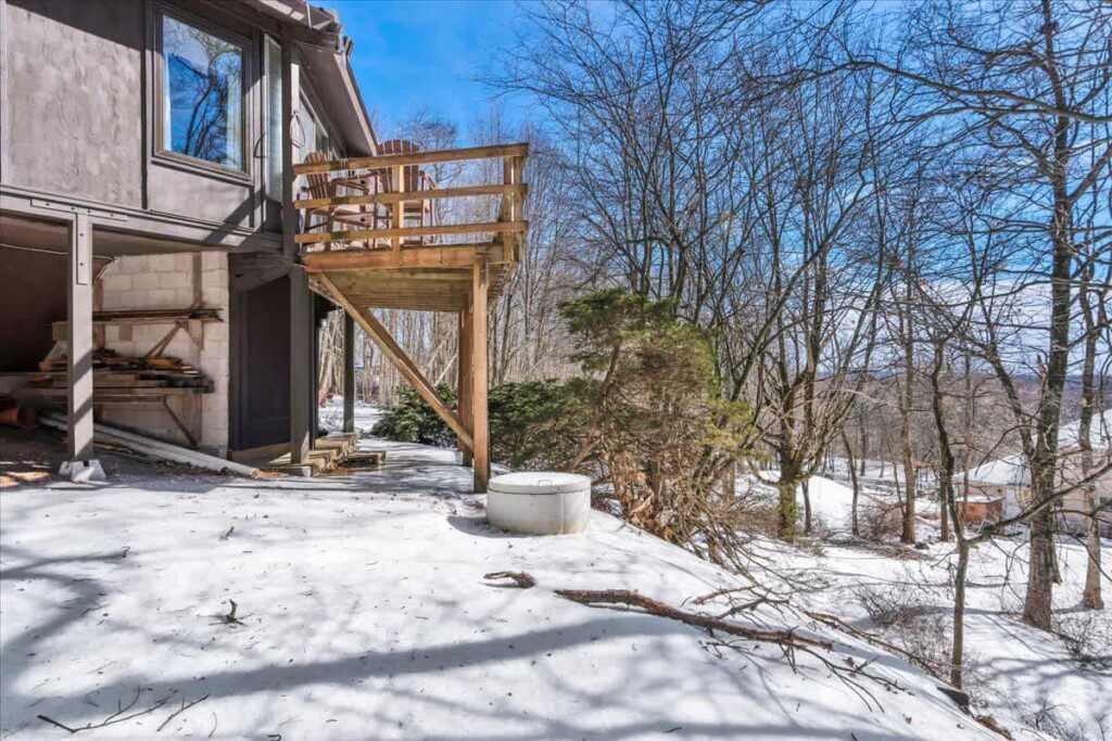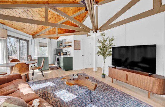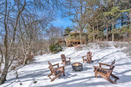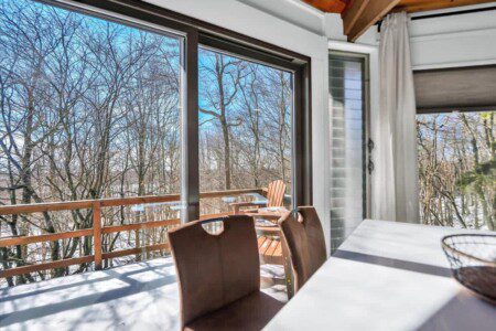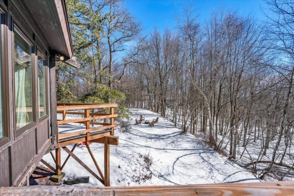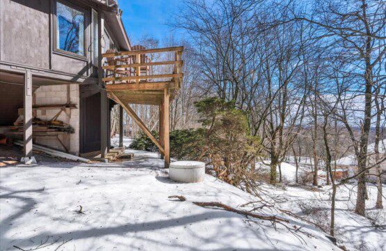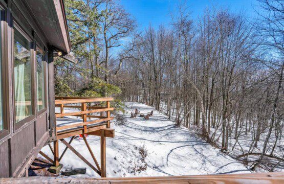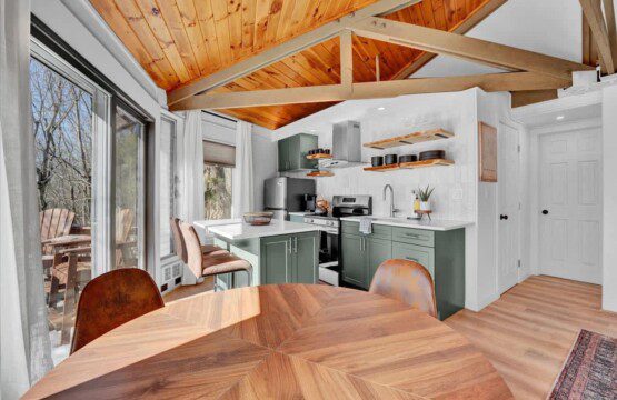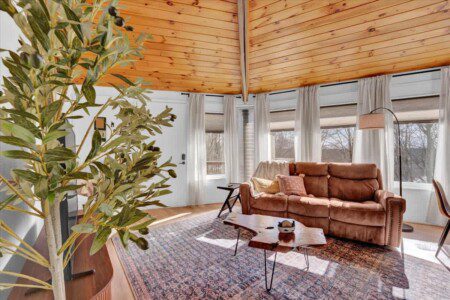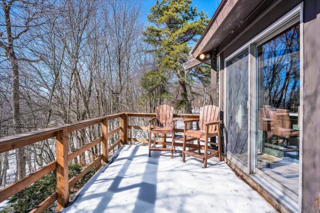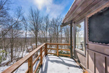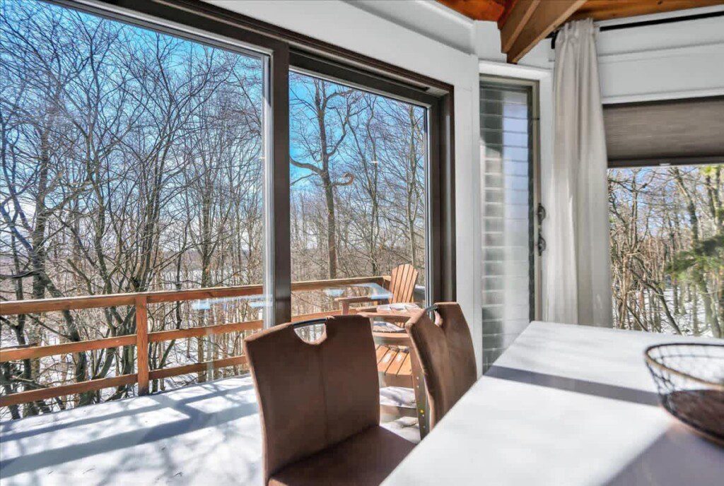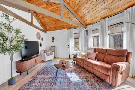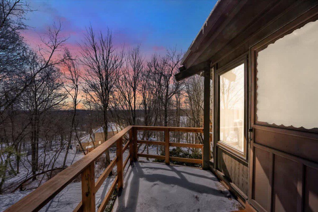 As you step up the stairs, you’re welcomed into a warm and inviting living room, where expansive windows frame breathtaking views of the surrounding treetops. It’s the perfect spot to relax, whether you’re hanging out indoors or watching the snow gently fall outside. The newly renovated kitchen, with its elegant quartz countertops, offers both style and functionality for some cozy home cooking. Each bedroom is a peaceful retreat, featuring stylish atmospheres and panoramic views of the scenic Poconos. Both bathrooms are sleek and modern, providing a luxurious touch to this beautiful unique home.