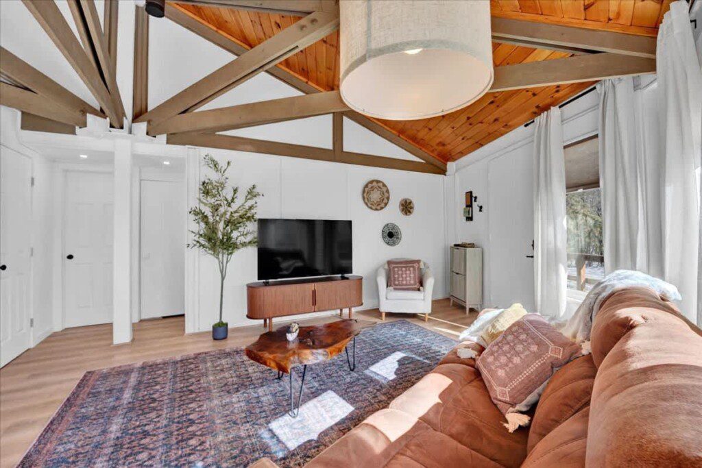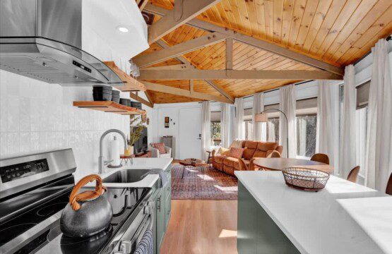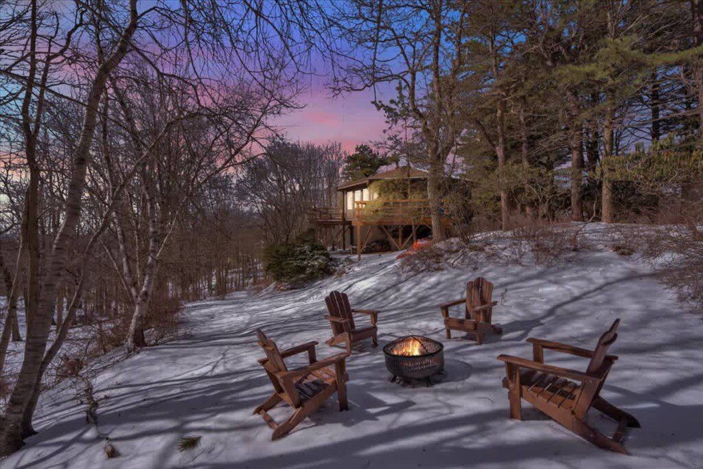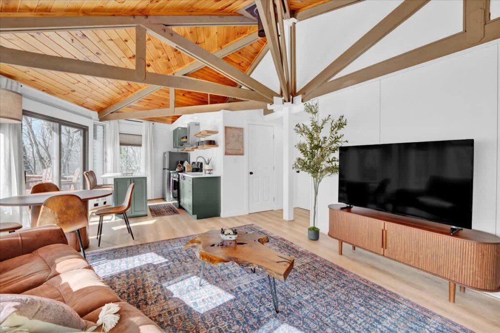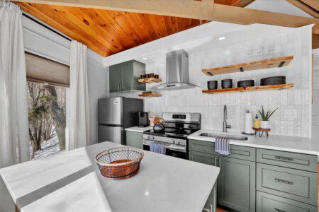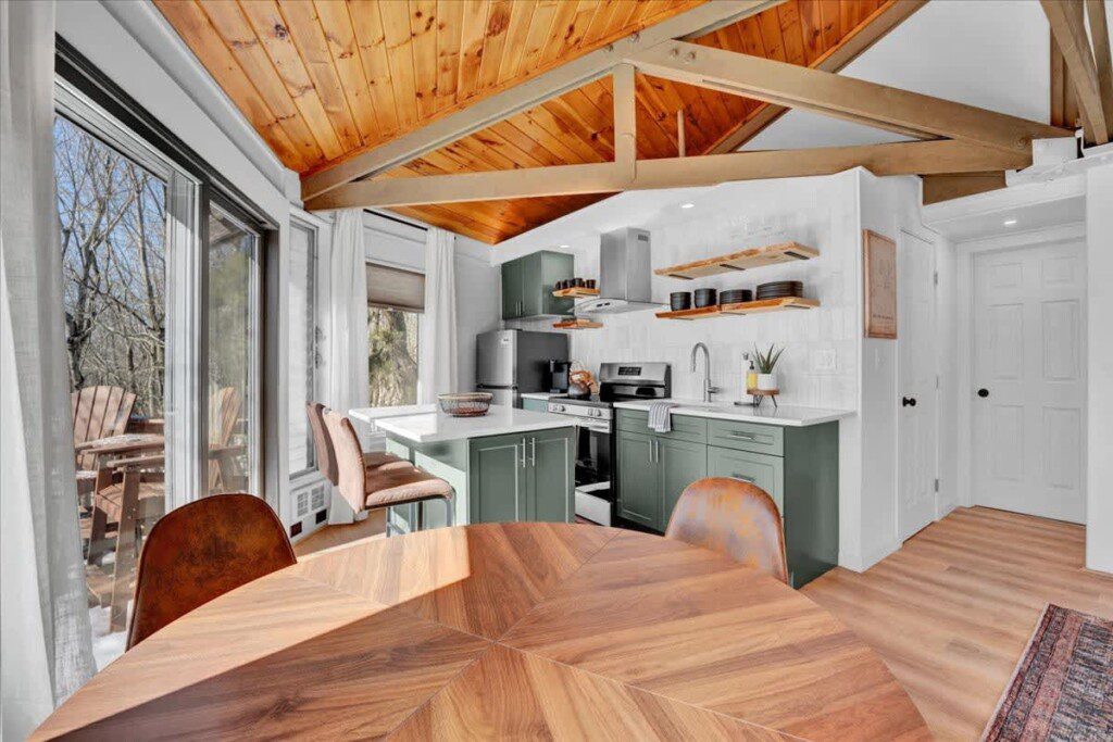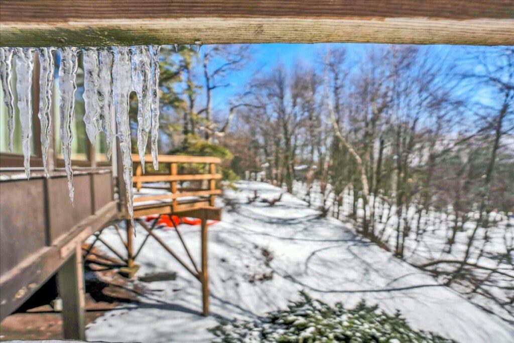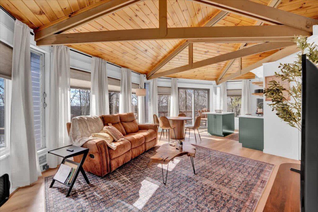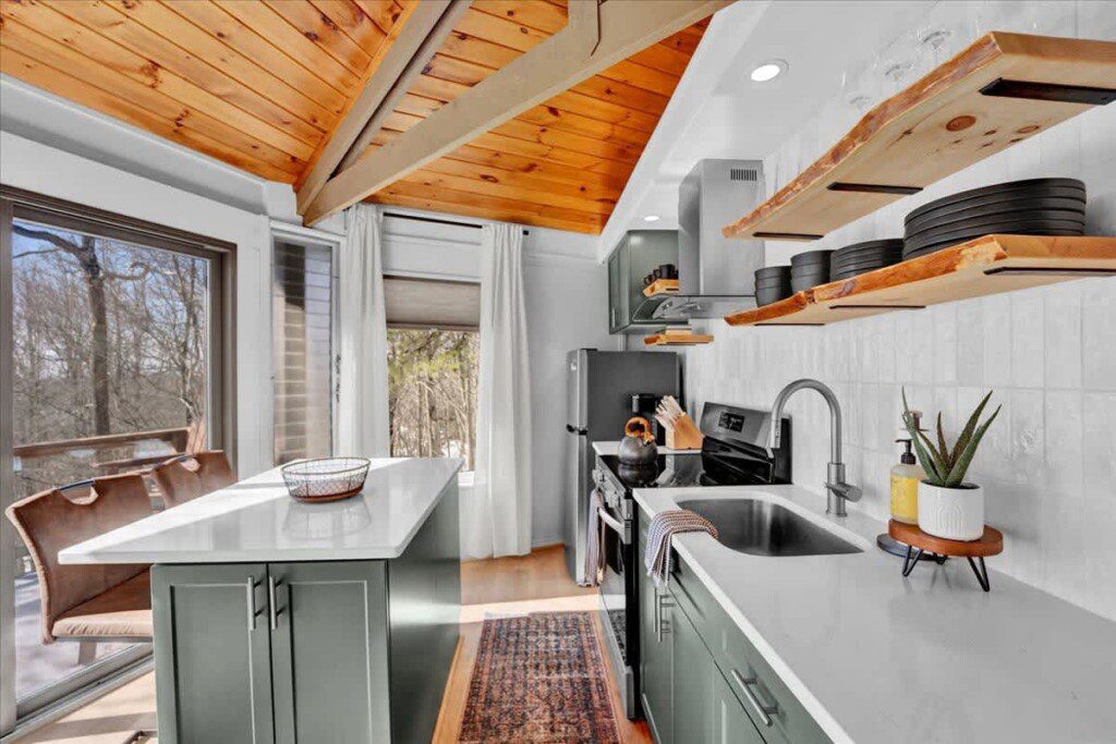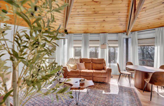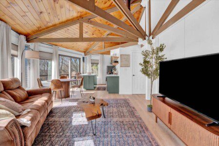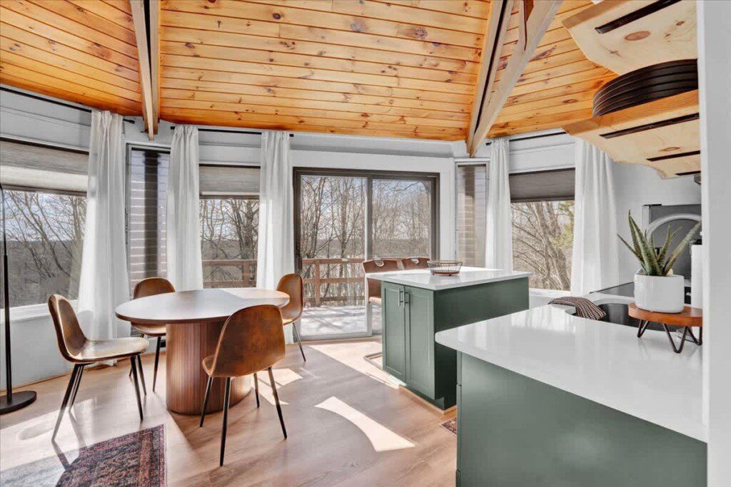 As you step up the stairs, you’re welcomed into a warm and inviting living room, where expansive windows frame breathtaking views of the surrounding treetops. It’s the perfect spot to relax, whether you’re hanging out indoors or watching the snow gently fall outside. The newly renovated kitchen, with its elegant quartz countertops, offers both style and functionality for some cozy home cooking. Each bedroom is a peaceful retreat, featuring stylish atmospheres and panoramic views of the scenic Poconos. Both bathrooms are sleek and modern, providing a luxurious touch to this beautiful unique home.