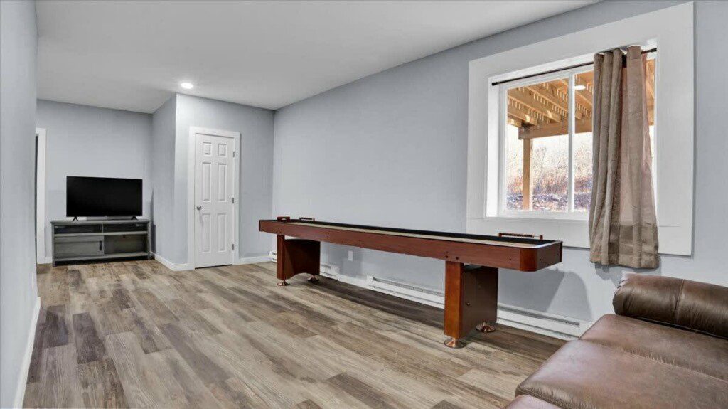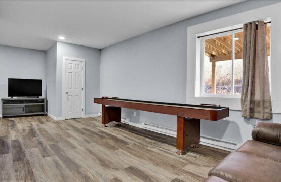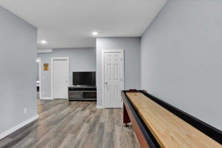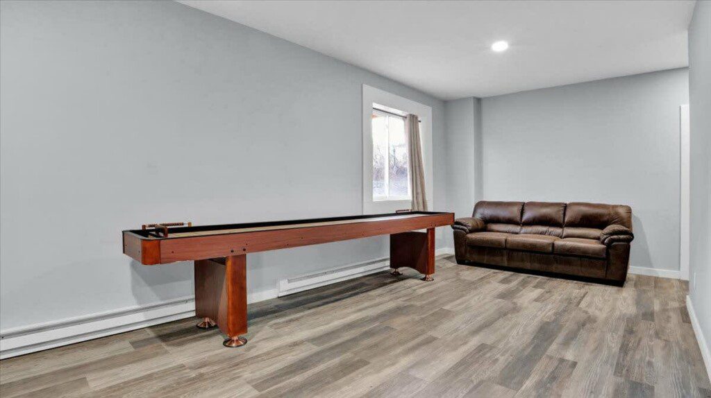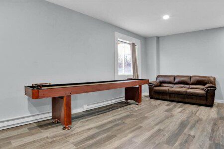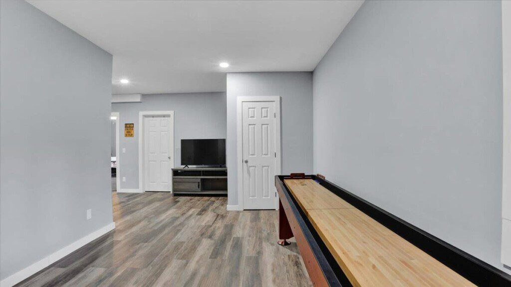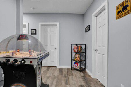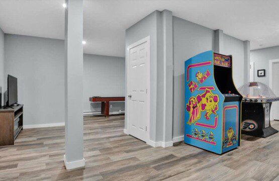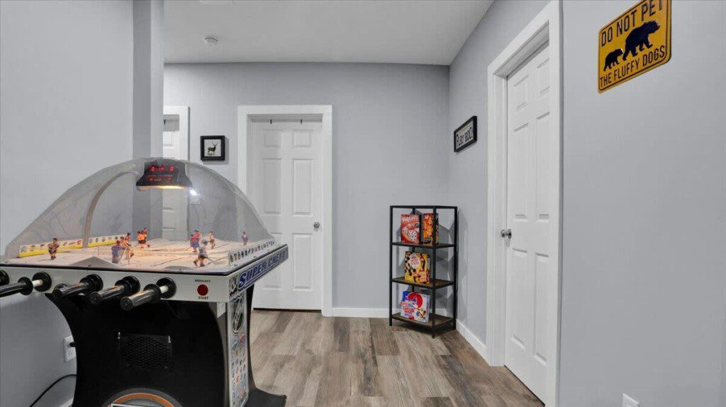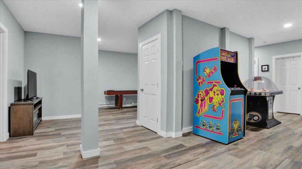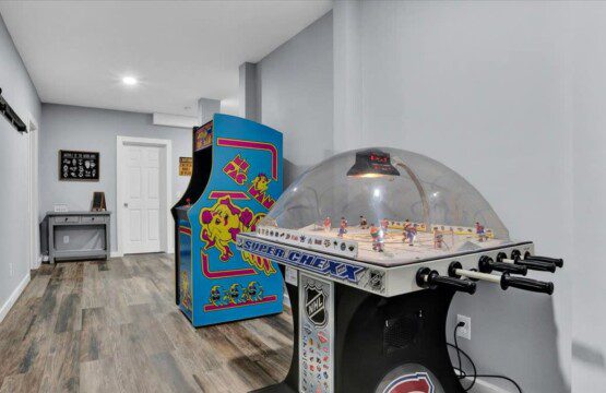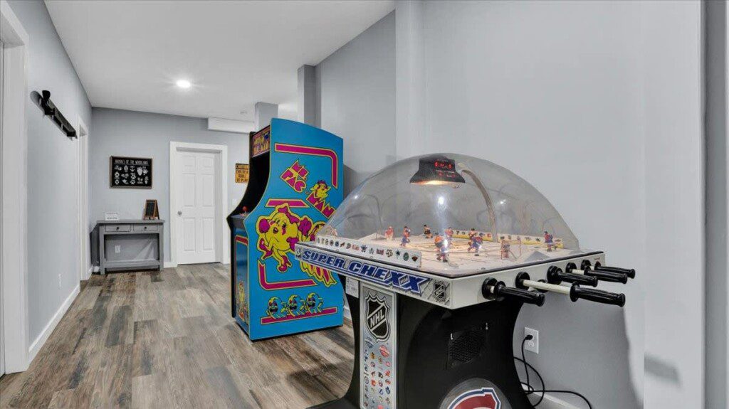 Saving what may be the best for last, the lower level features a world of entertainment. Starting with a comfy seating area, there are several games to choose from for a face off against the family. Shuffleboard, Pacman arcade, and bubble hockey await!