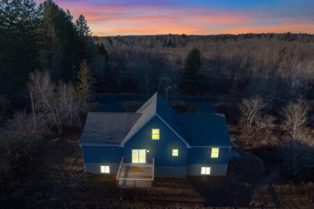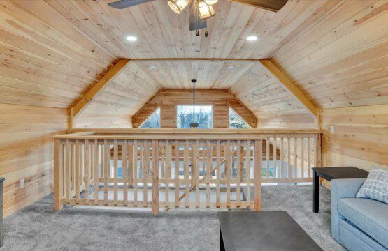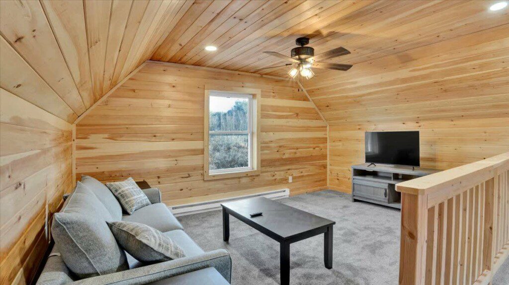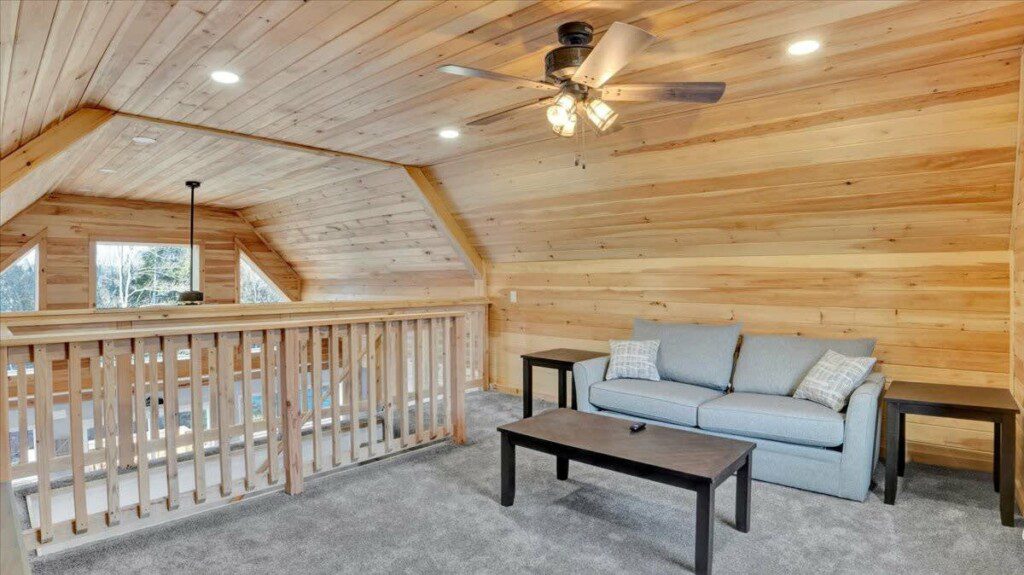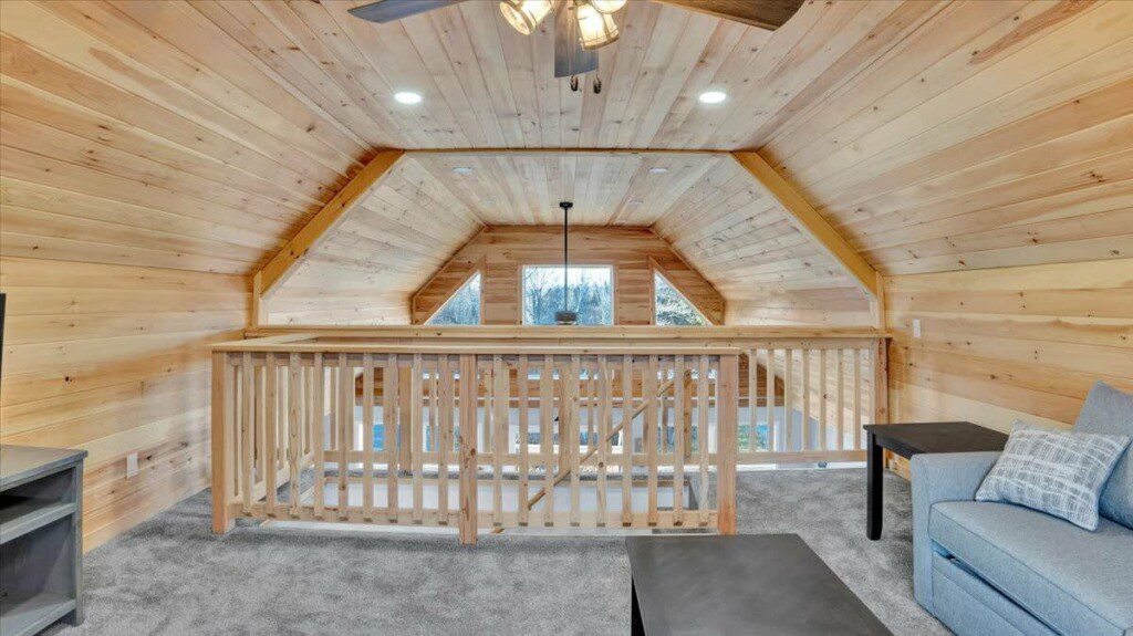 From the main floor, head up to the loft, boasting a couch of its own, views of the back woods, and debatably the coziest nook in the house.