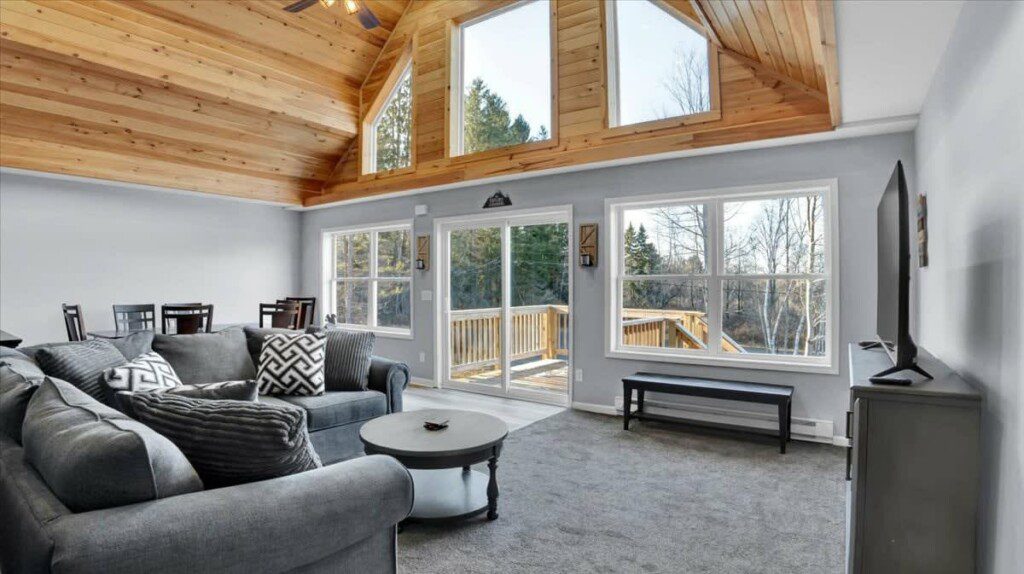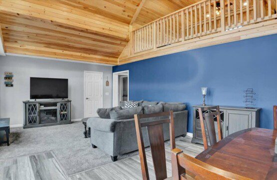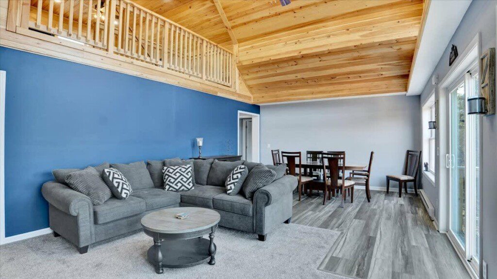 Enter the home to vaulted pine covered ceilings. Greeted by open concept living with an oversized couch and spacious dining table.