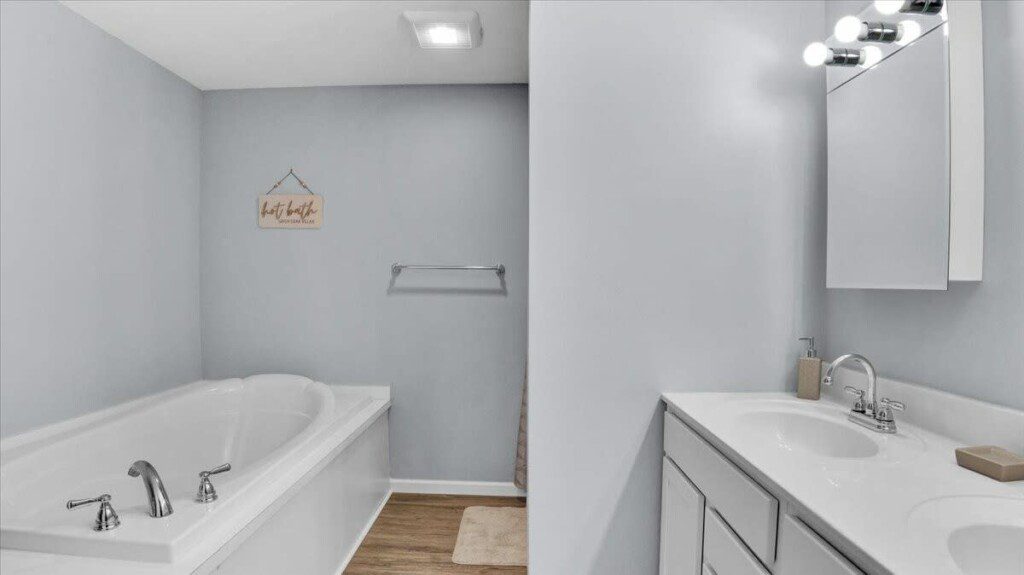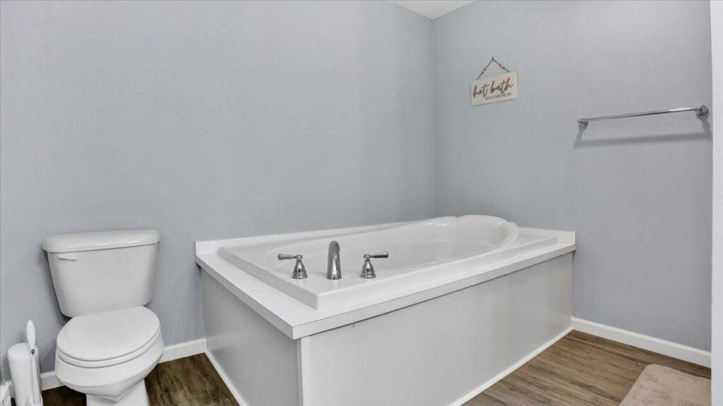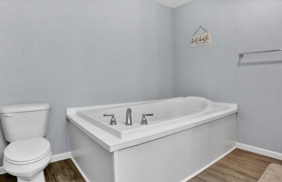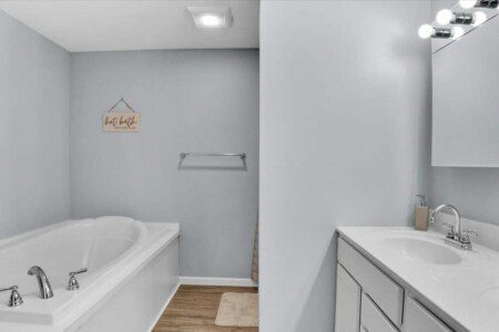 The first floor features three bedrooms. First is the master, outfitted with plenty of space to spread out, an ensuite bathroom with large soak tub, and walk-in shower.