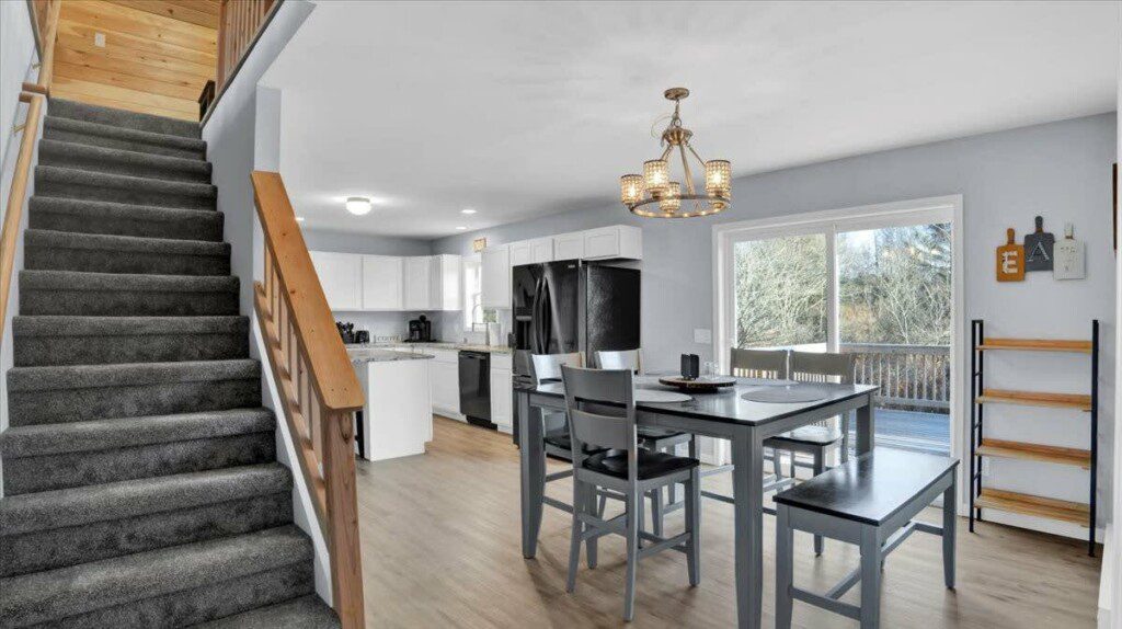 Off the kitchen, find a deck overlooking the Pocono trees.