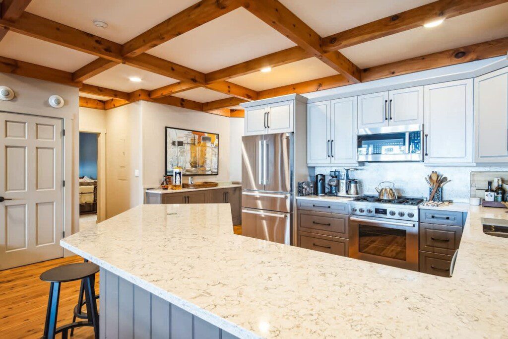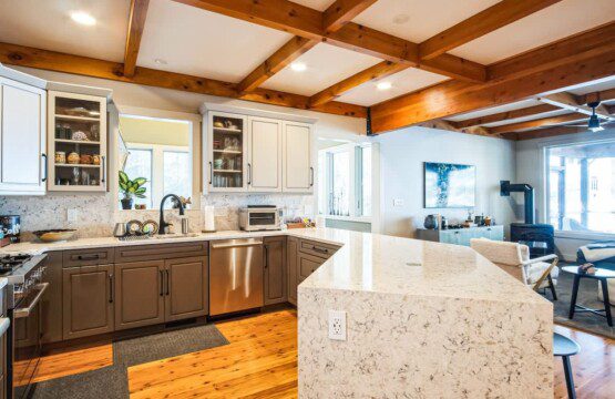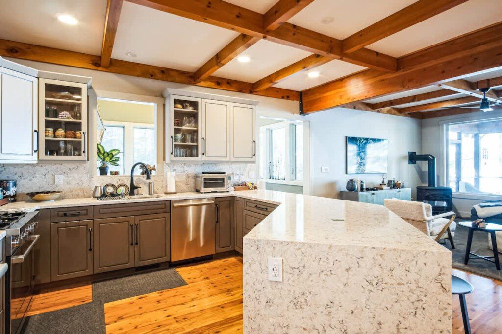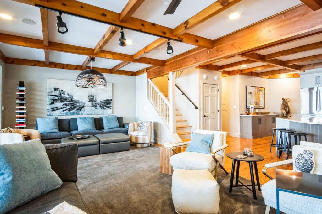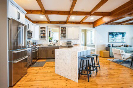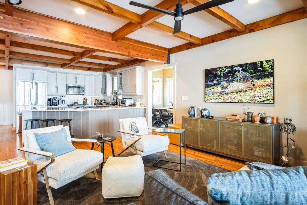 Step inside and be greeted by gorgeous beams and modern finishes in an open-concept design perfect for one large family or a few families