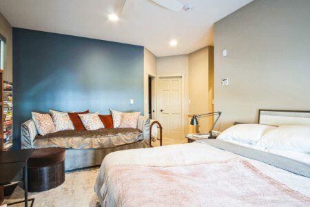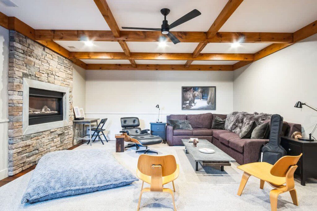 • Living Room ONE – Oversized couch, cozy ambiance, decorative fireplace, and Smart TV