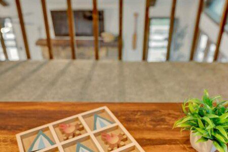 INDOOR LIVING: Smart TV w/ cable fireplace(NOT AVAILABLE), shower/bathtub, dining table for 6, arcade games