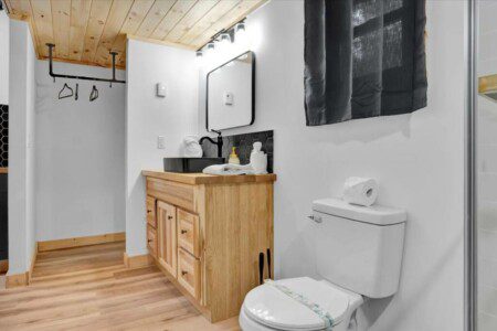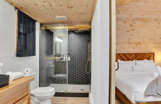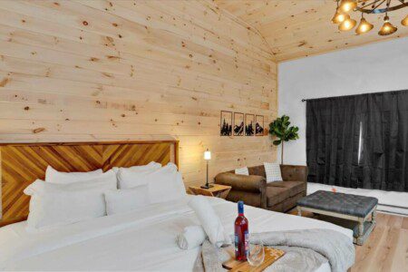 Have a relaxing stay in this charming cabin themed unit with modern amenities and tasteful décor, perfect to nestle up in on a snowy day as you watch the flakes fall gentle onto the pine trees around you.