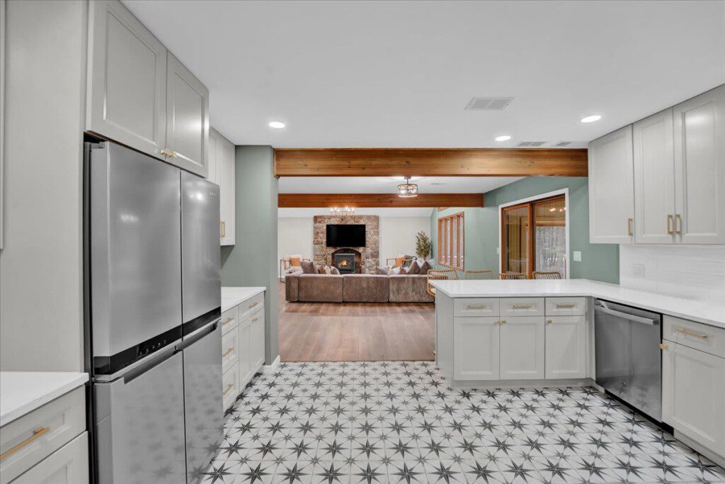 Sleek, modern kitchen with high ceilings and exposed wood beams