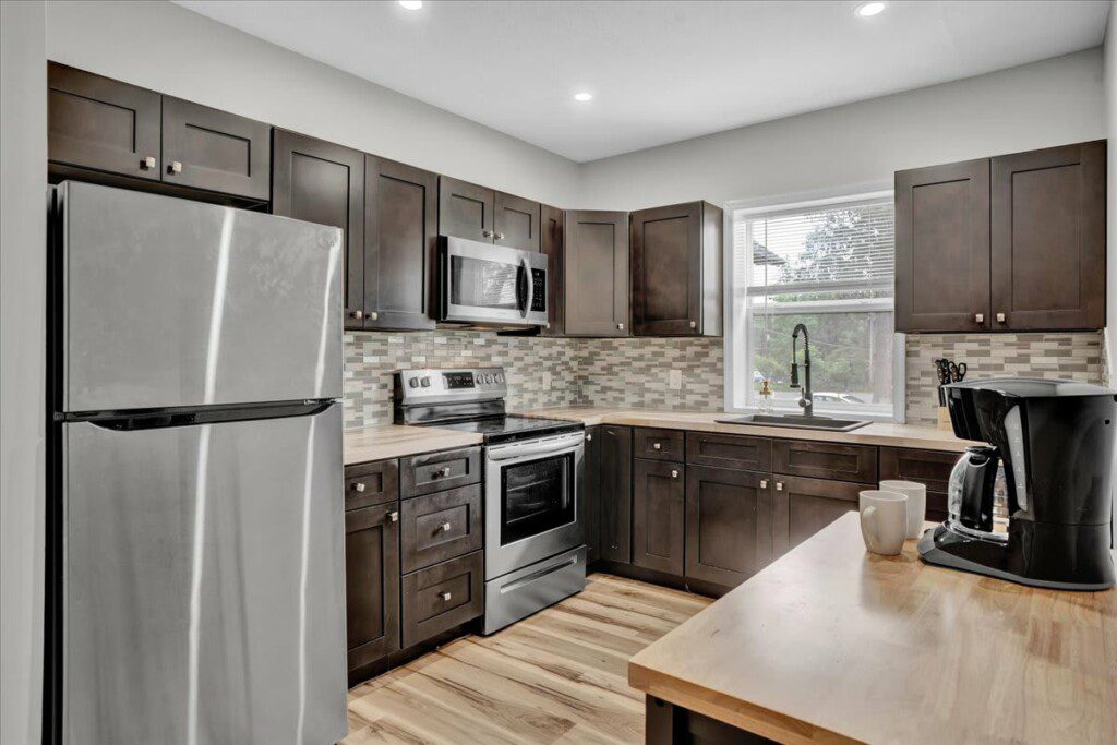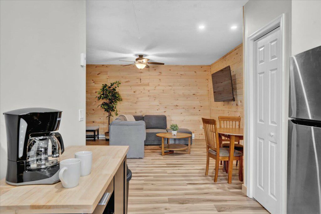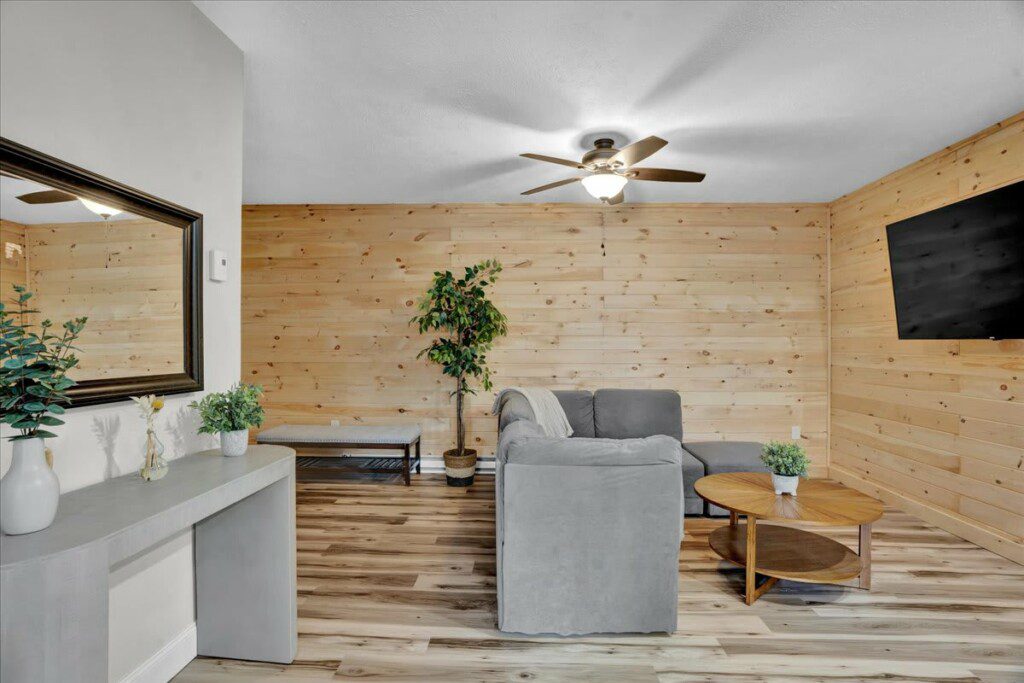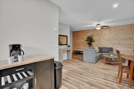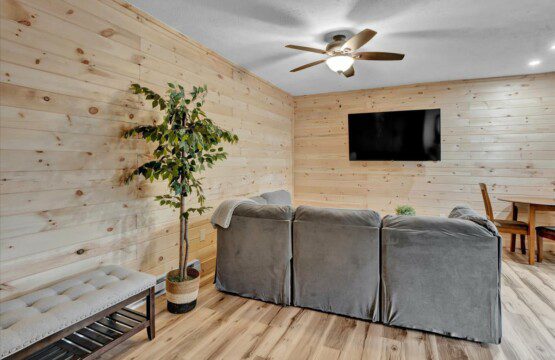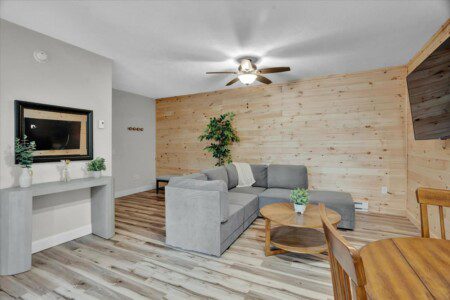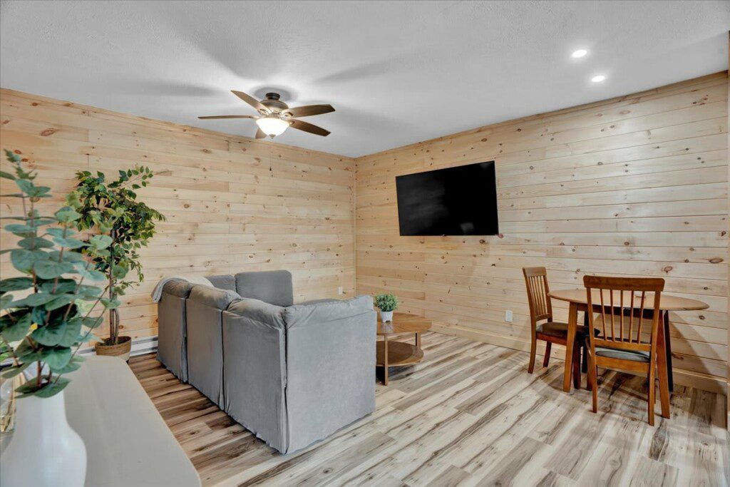 Have a relaxing stay in this charming cabin themed unit with modern amenities and tasteful décor, perfect for a Summer homebase or to nestle up in on a snowy day as you watch the flakes fall gentle onto the pine trees around you.