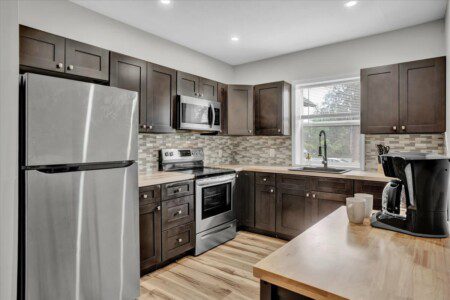 The brand new full kitchen is well appointed with a deep sink and plenty of space to prepare a meal