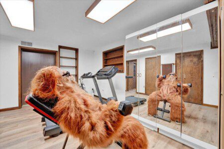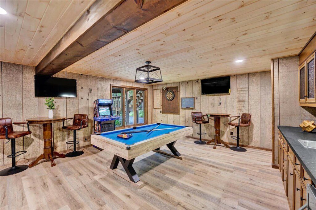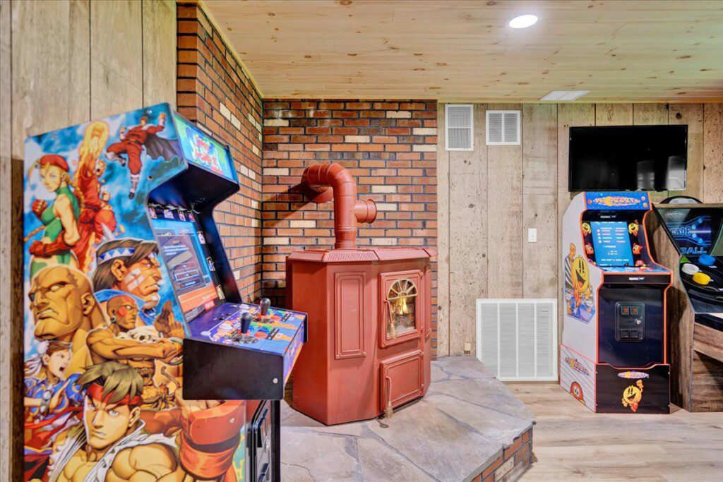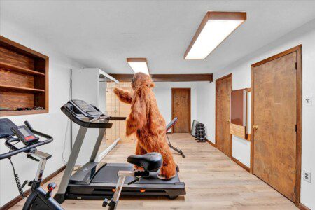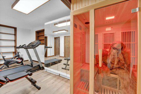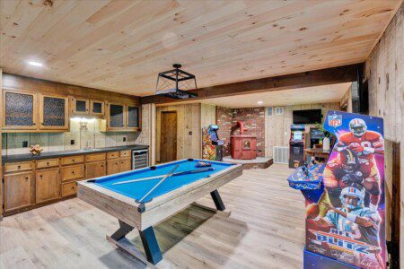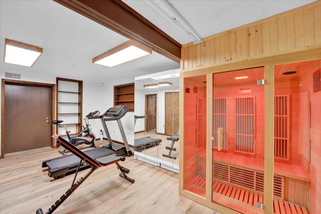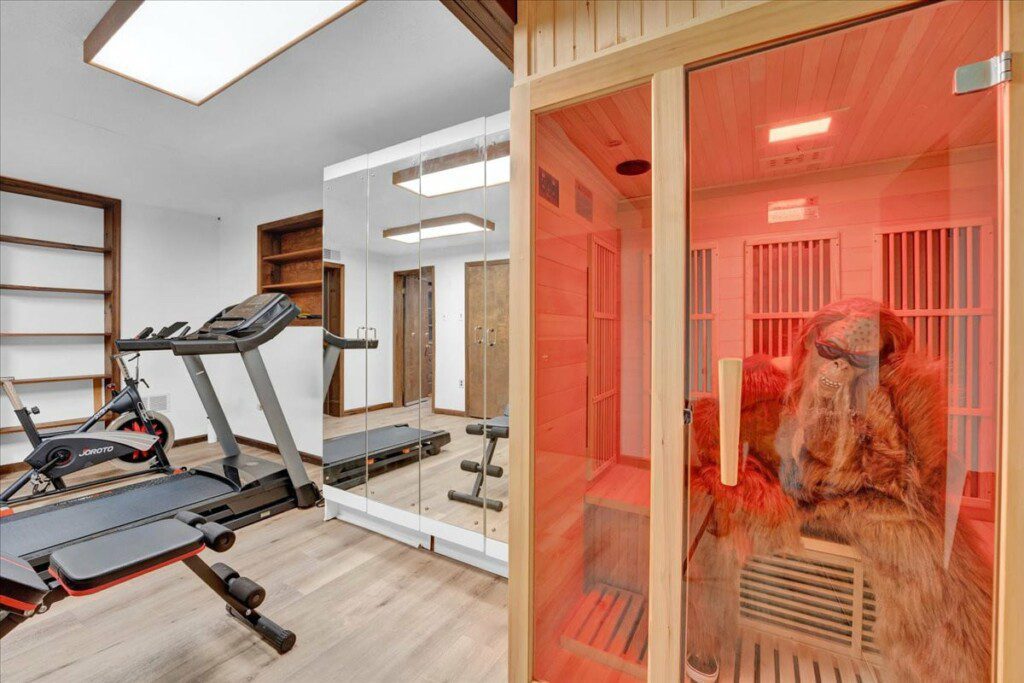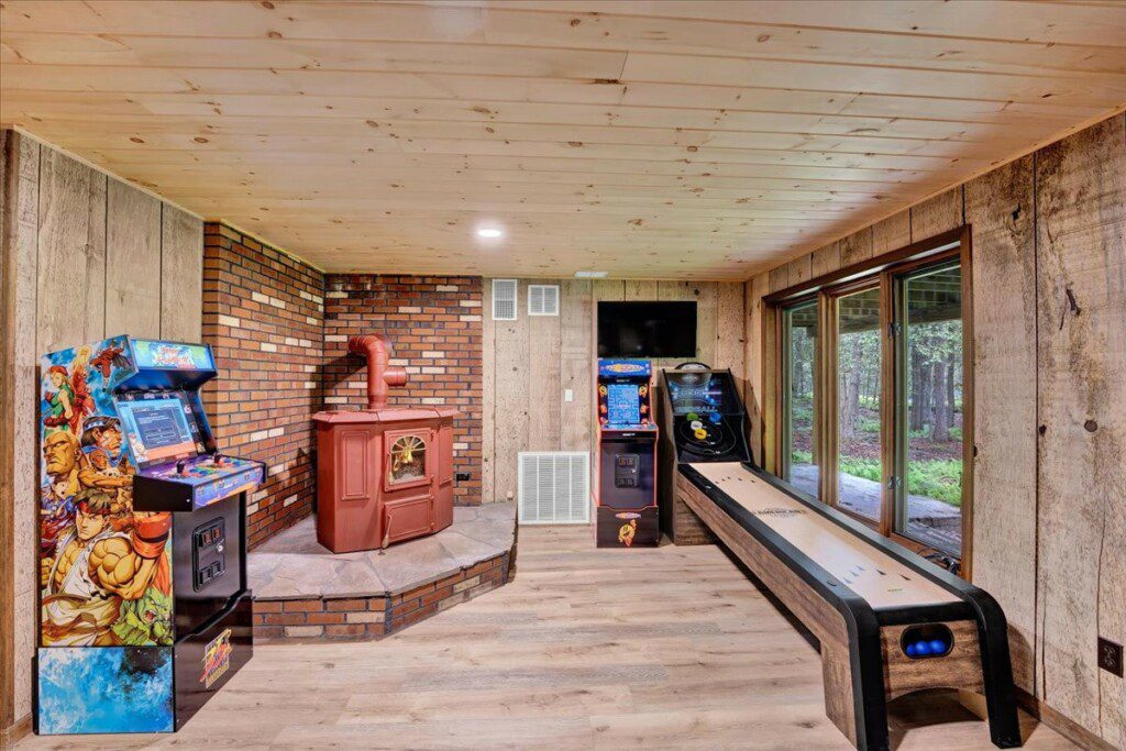 Downstairs, there’s a fantastic game room with arcade games, skee-ball, and a pool table—great for some fun and games. There are three Flat screen TV’s for an amazing game day experience, and a few high top tables. The basement also houses a well-equipped gym with a Nordic treadmill, weights, and a sauna for staying active and relaxing all at once.