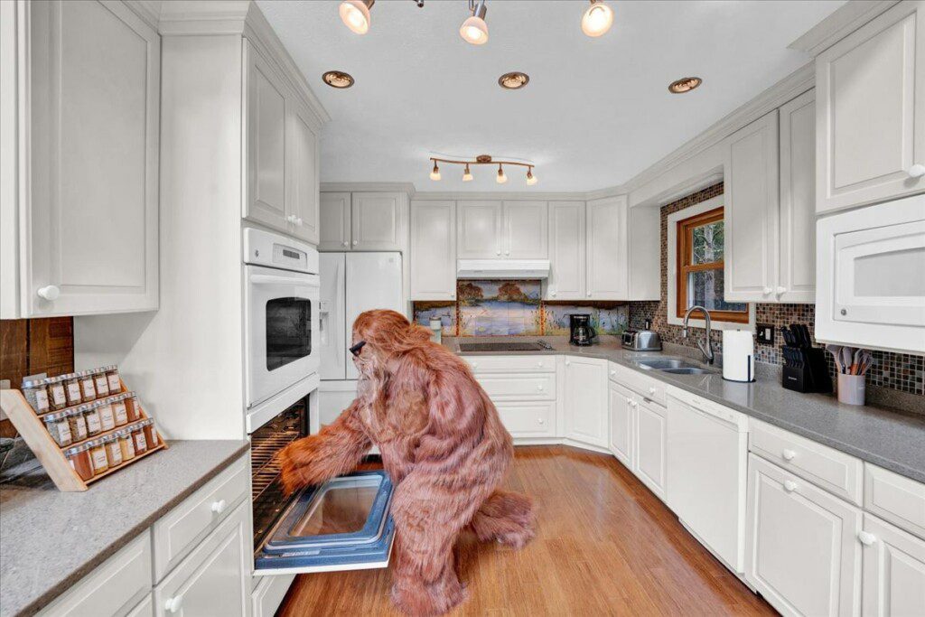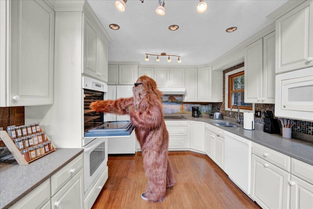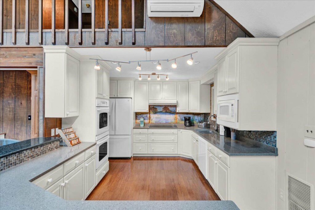 When it comes to dining, you’re in for a treat. The dining room is huge with high ceilings and a beautiful stone fireplace (decor only) that adds a warm touch. The kitchen next to it is spacious and fully equipped—perfect for whipping up your favorite meals.