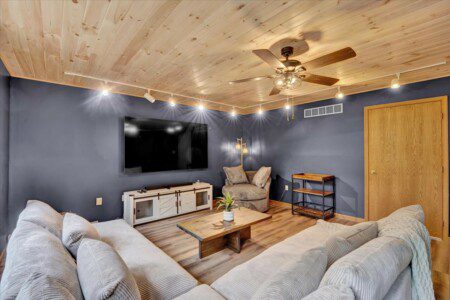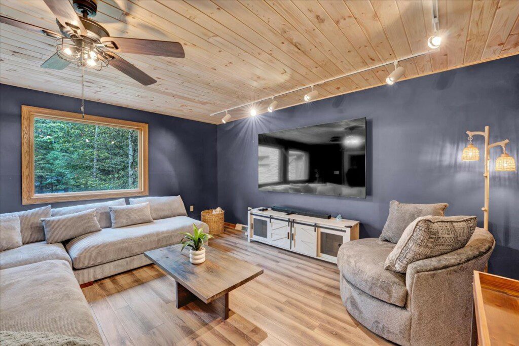 Right when you walk in, you’ll be greeted by the movie room. It’s perfect for unwinding with a giant flatscreen TV, a high-quality soundbar, and super comfy couches. It’s all set up for a family movie night.
