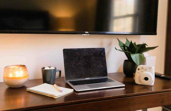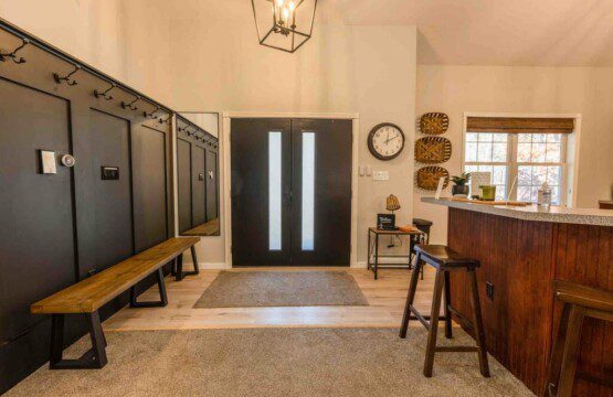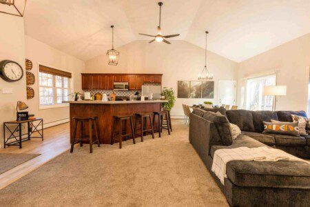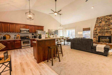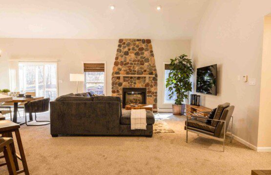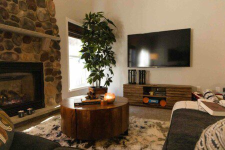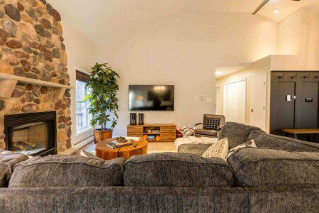 The living room has an indoor gas fireplace with a 65″ smart TV and an extra large sofa sectional.