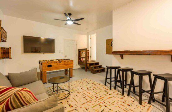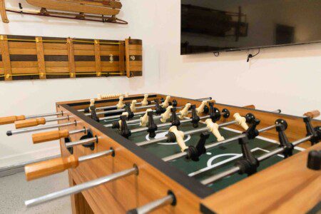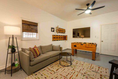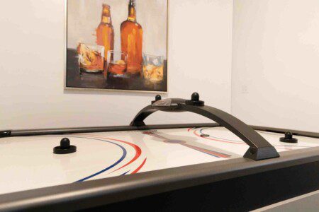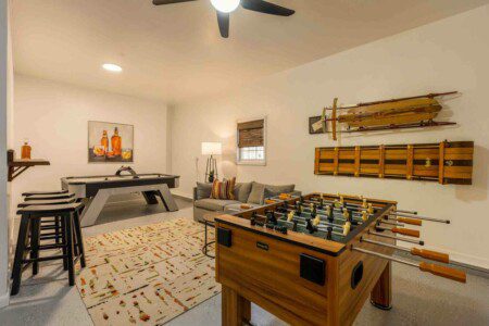 The garage area is where you will find the entertainment area. Our garage has been insulated and converted into a game room with foosball, air hockey, a smart TV, and a pull out sofa bed!